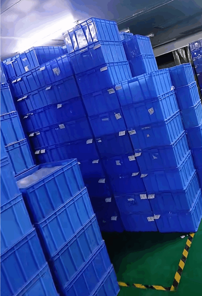 在庫保管エリア。用途別に区分されたボックスでロット管理を徹底。